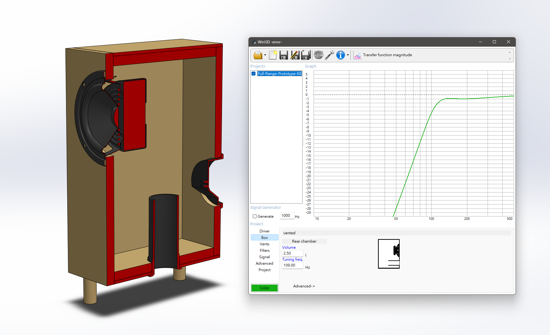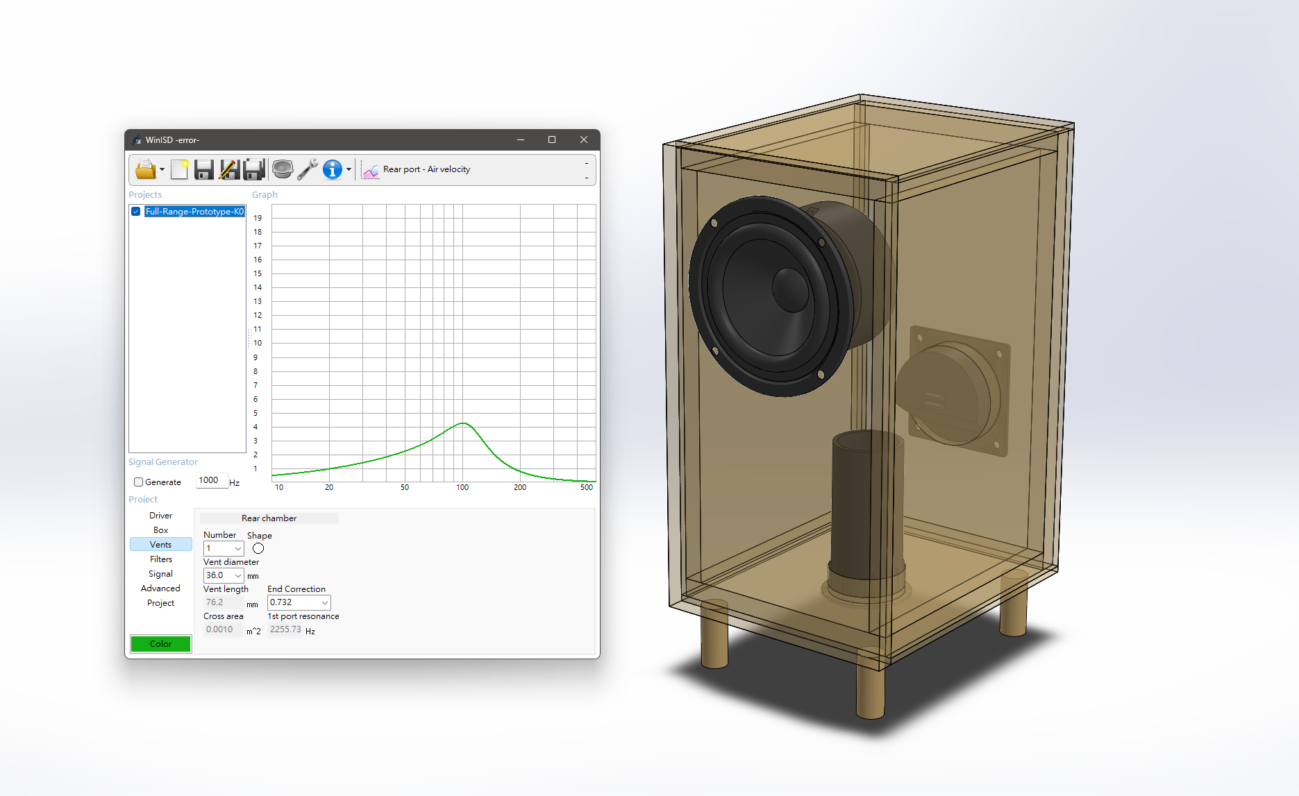 We purchased a pair of 3-inch full-range drivers with acoustic parameters provided by the supplier as our starting point. After referencing the research materials, we used WinISD for acoustic simulations of the enclosure, confirming the suitable enclosure volume and dimensions of the inverted tubes.